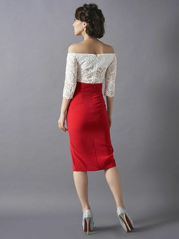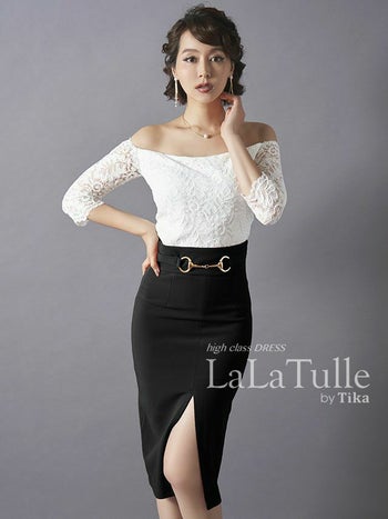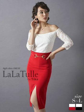 4. レース 袖あり タイト セットアップ オフショルダー タイトひざ丈ドレス[ホワイト×レッド/ホワイト×ブラック][Lあり][青田夏奈/キャバドレス着用]