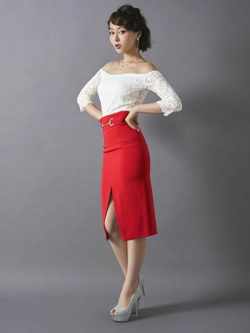 3. レース 袖あり タイト セットアップ オフショルダー タイトひざ丈ドレス[ホワイト×レッド/ホワイト×ブラック][Lあり][青田夏奈/キャバドレス着用]