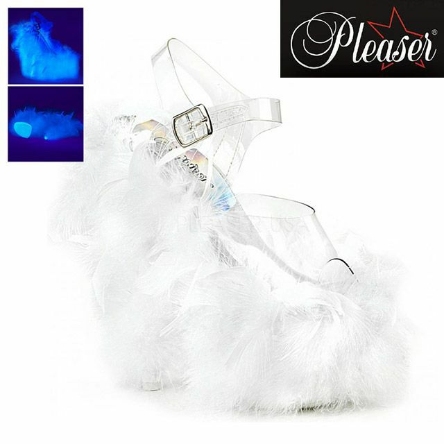 【PLEASER/プリーザー】キャバヒール アンクル ストラップ フェザー ファー デザイン 厚底 ハイヒール クリア サンダル[クリア×ホワイト][22.8cm~25.4cm][17cmヒール]