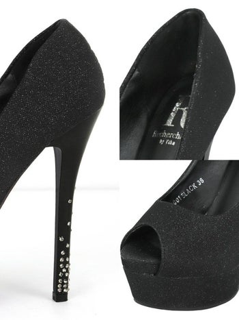 14cmヒール☆脚長&美脚を叶える一足! 【Rechercher/ルシェルシェ】ビジュー オープントゥ ラメ パンプス (ブラック)