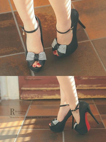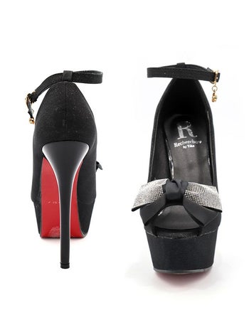 5. SALE【Rechercher/ルシェルシェ】ガーリー グリッター リボンデザイン アンクルストラップ チャーム付き ハイヒール オープントゥ パンプス (ブラック)