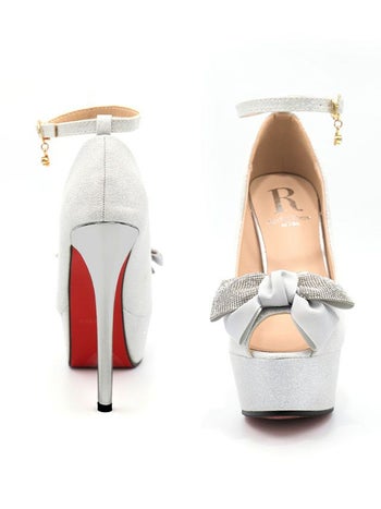 5. SALE【Rechercher/ルシェルシェ】ガーリー リボンデザイン グリッター アンクルストラップ チャーム付き ハイヒール オープントゥ パンプス (シルバー)