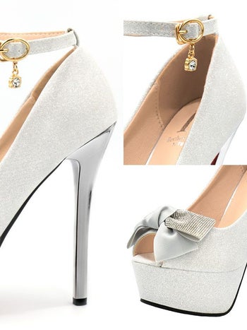 14cmヒール☆リボンデザインが可愛い! SALE【Rechercher/ルシェルシェ】ガーリー リボンデザイン グリッター アンクルストラップ チャーム付き ハイヒール オープントゥ パンプス (シルバー)