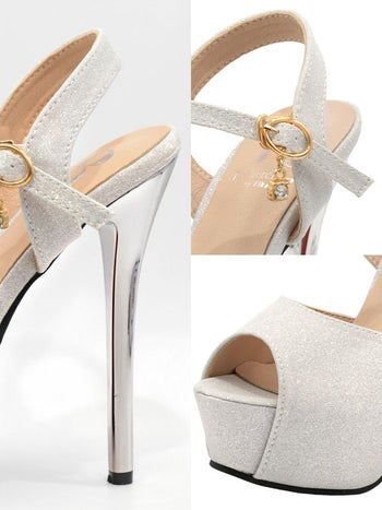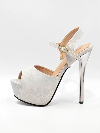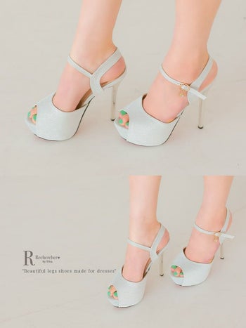 14cmヒール☆ラメの輝きが美しい! SALE【Rechercher/ルシェルシェ】ラメ ビジューチャーム ストラップ付き オープントゥ サンダル (シルバー)