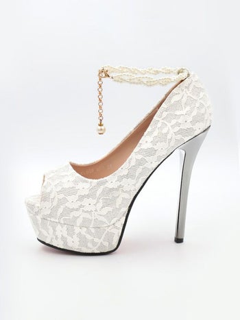 4. 【Rechercher/ルシェルシェ】ガーリー フラワーレース アンクルストラップ パール チャーム ハイヒール オープントゥ パンプス (シルバー)