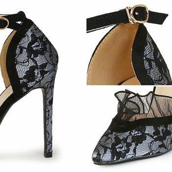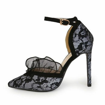 ブラックフリルレースパンプス [ブラック×グレー][22.5cm~25.0cm][11cmヒール]