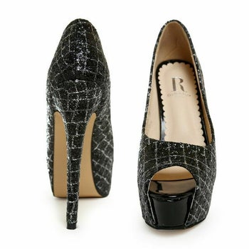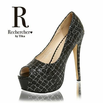 Rechercher ルシェルシェ 格子デザインストーンパンプス(ブラック)送料無料