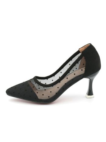 4. シースルー ドット柄 スクエア型トップリフト ポインテッドトゥ パンプス(ブラック)