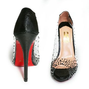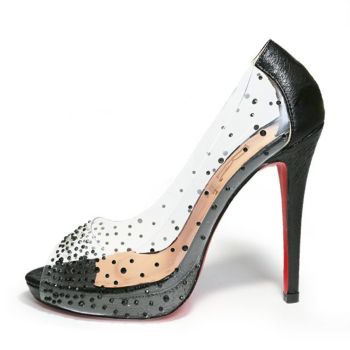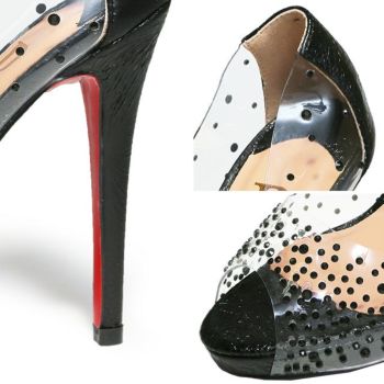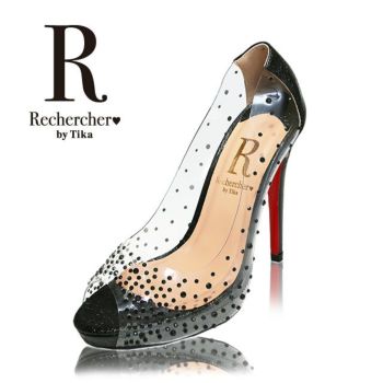 【Rechercher/ルシェルシェ】キャバヒール ビジュデザイン クリア オープントゥ パンプス[ブラック][22.5cm~25.0cm][12cmヒール]