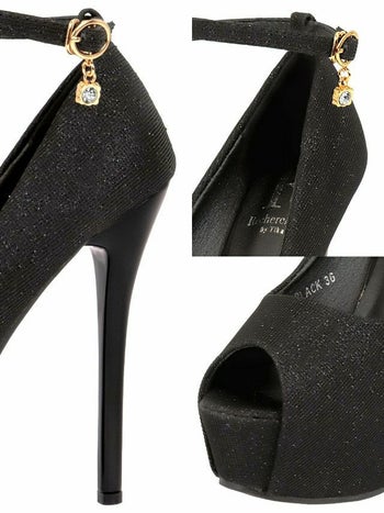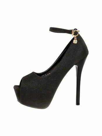 5. 【Rechercher/ルシェルシェ】ラメ ワンカラー アンクルチャーム付き シンプル ハイヒール オープントゥパンプス(ブラック)