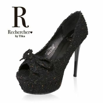 4. 【Rechercher/ルシェルシェ】キャバヒール リボンモチーフ ツイード パンプス[ブラック][22.5cm~25.0cm][13cmヒール]