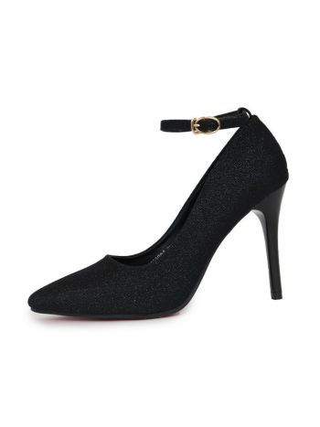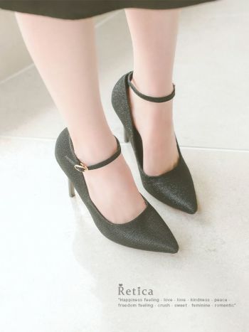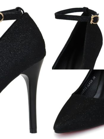 10.5cmヒール☆シンプルで使い回しやすい♪ アンクルストラップ付き ポインテッドトゥ ラメ パンプス(ブラック)