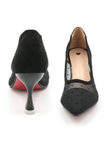 4. シースルー ドット柄 スクエア型トップリフト ポインテッドトゥ パンプス(ブラック)
