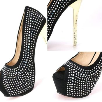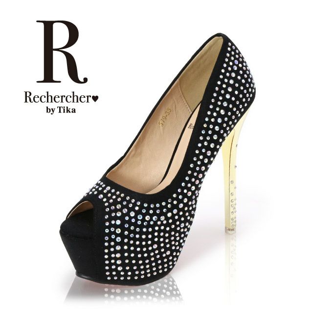 きらめくビジューを全体的に散りばめたオープントゥパンプス。