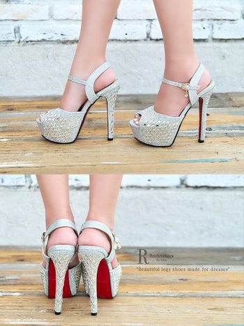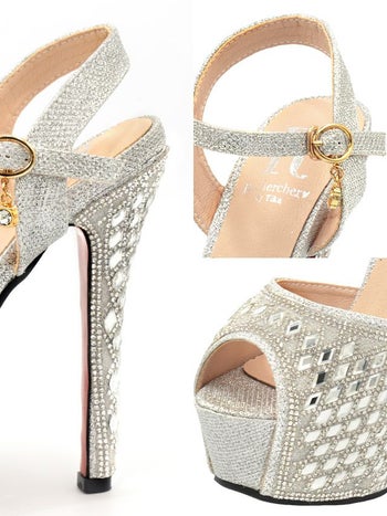 4. 【Rechercher/ルシェルシェ】ゴージャス ビジュー 格子柄 ハイヒール ストラップ付き オープントゥ サンダル (シルバー)
