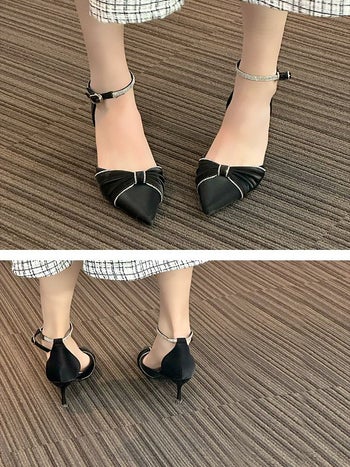 5. ビジュー アンクルストラップ付き ポインテッドトゥ リボンデザイン パンプス(ブラック)