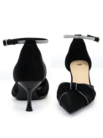 6cmヒール☆リボンデザインがCUTE♪ ビジュー アンクルストラップ付き ポインテッドトゥ リボンデザイン パンプス(ブラック)
