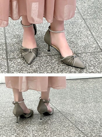 4. リボンデザイン ビジュー アンクルストラップ付き ポインテッドトゥ パンプス(グレージュ)