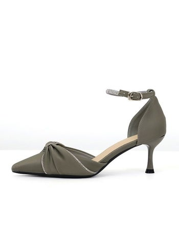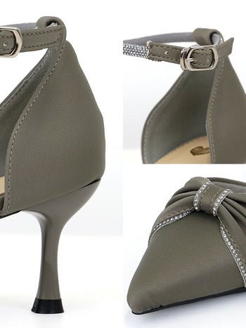 3. リボンデザイン ビジュー アンクルストラップ付き ポインテッドトゥ パンプス(グレージュ)