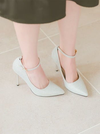 4. ラメ アンクルストラップ付き ポインテッドトゥ パンプス(シルバー)