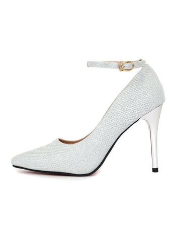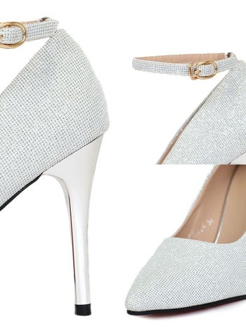 10.5cmヒール☆普段使いとしてもピッタリな一足♪ ラメ アンクルストラップ付き ポインテッドトゥ パンプス(シルバー)