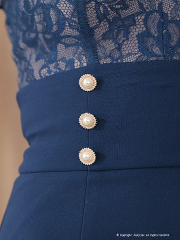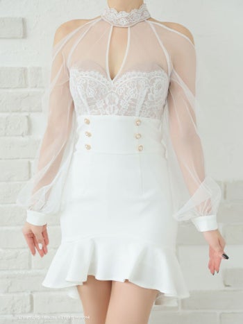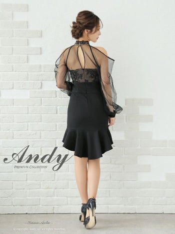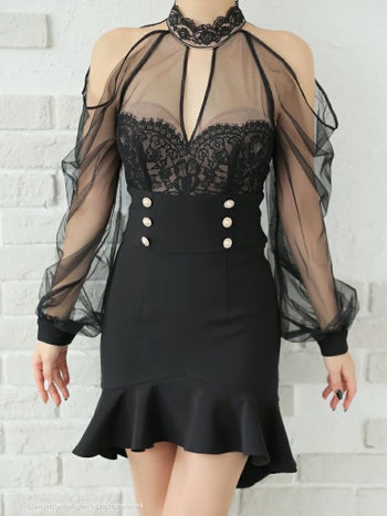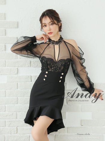 キャバドレス フレアミニドレス Andy アンディ レース 飾りボタン 長袖 シースルー 肩あき
