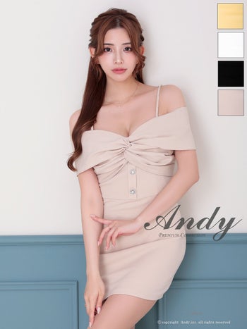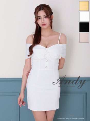 キャバドレス Andy アンディ 飾りボタン ビジュー クロスデザイン ワンカラー 肩あき オフショルダー タイトミニドレス