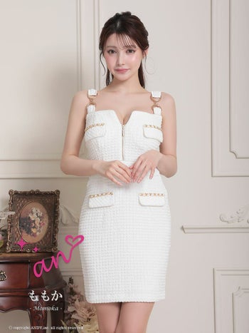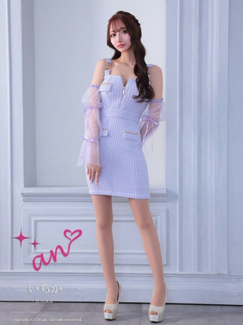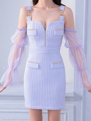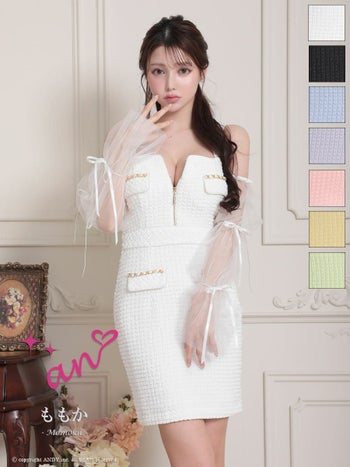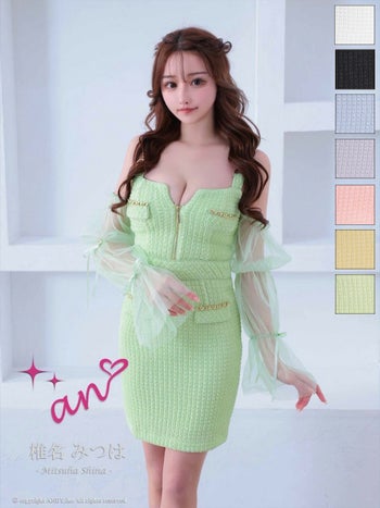 キャバドレス an 長袖 シアー 肩あき バックカット ジップデザイン リボン フェイクポケット タイトミニドレス