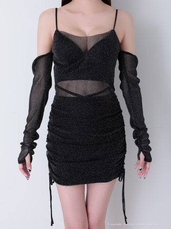 2way 肩あき キャミソール くびれ透け チュール 長袖 シアースリーブ ドローストリング タイトミニドレスの詳細画像1