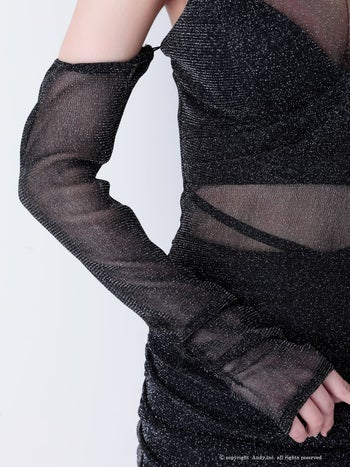 2way 肩あき キャミソール くびれ透け チュール 長袖 シアースリーブ ドローストリング タイトミニドレスの詳細画像4