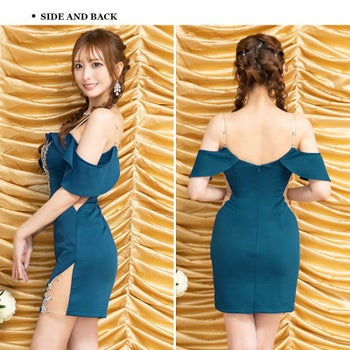 キャバドレス ブランド オープンバスト くびれ透け メッシュ 肩あき セクシー フリルスリーブ フロントビジュー タイトミニドレス