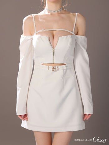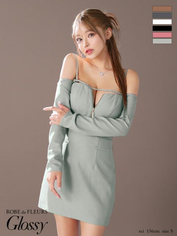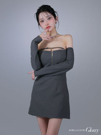 XSあり!気分で着こなしを変えられる☆ 【Glossy by ROBE de FLEURS/グロッシー】オープンバスト ジップデザイン 肩あき 長袖 ウエストカット ベルトデザイン セクシー タイトミニドレス (GL3576)