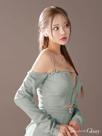 3. 【Glossy by ROBE de FLEURS/グロッシー】オープンバスト ジップデザイン 肩あき 長袖 ウエストカット ベルトデザイン セクシー タイトミニドレス (GL3576)