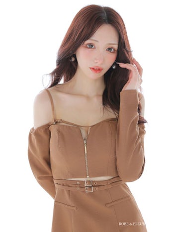 5. 【Glossy by ROBE de FLEURS/グロッシー】オープンバスト ジップデザイン 肩あき 長袖 ウエストカット ベルトデザイン セクシー タイトミニドレス (GL3576)
