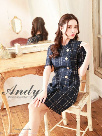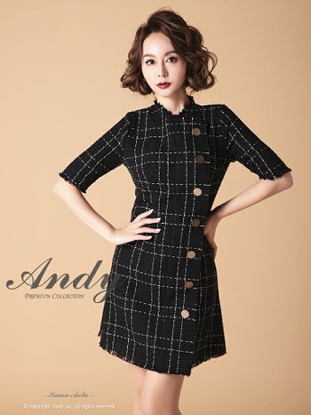 キャバドレス Andy アンディ ゴールドボタン チェック柄 ハイネック 袖あり タイトミニドレス