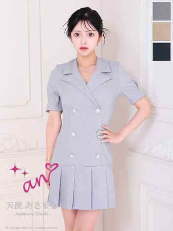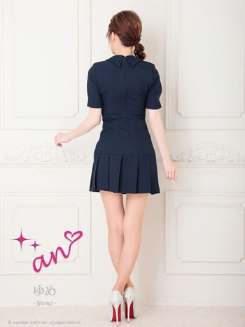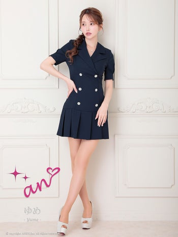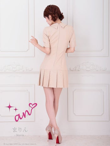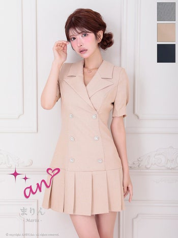キャバドレス an アン パフスリーブ 襟付き 袖あり ビジューボタン プリーツ Vカット フレアミニドレス