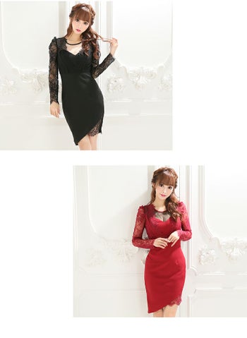 大人かわいいフェミニンな高級キャバ ワンピース♪ 【DEA.by ROBE de FLEURS/ディア】レース切替×袖あり タイトミニドレス[Lあり][2173]