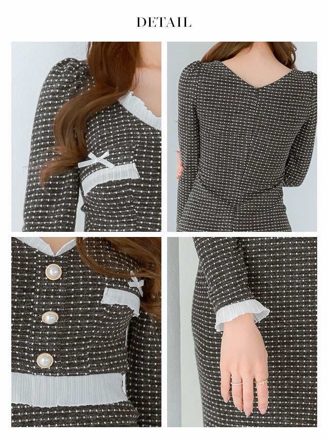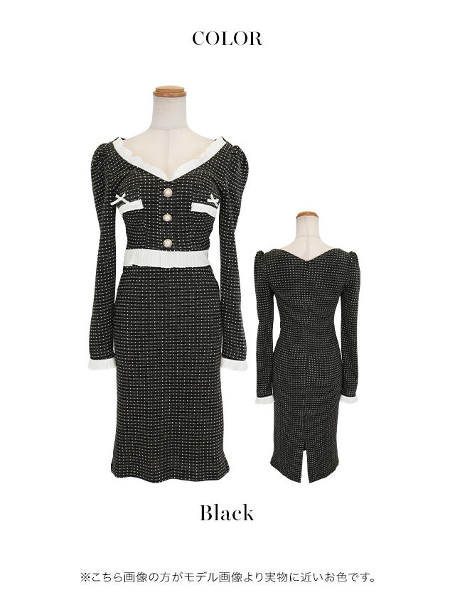 他の画像を見る Lあり!甘すぎない大人ガーリー♪ 【Anella/アネラ】リボン フリル ガーリー 長袖 ツイード モノトーン パールボタン タイト 膝丈ドレス 即日発送 ¥ 16,500 税込 詳細を見る お気に入りに登録する