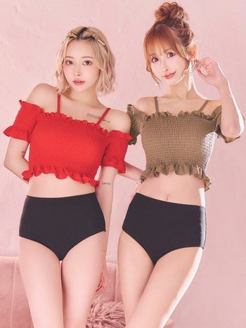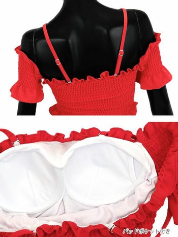 ガーリー オフショルダーデザイン シャーリングギャザー ビキニ