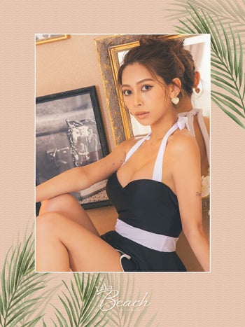 4. 【水着】韓国風 バイカラー フリルワンピース ホルターネック モノキニビキニ
