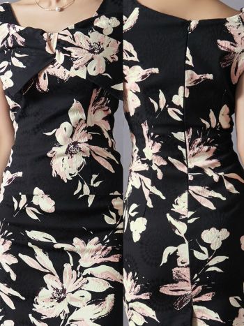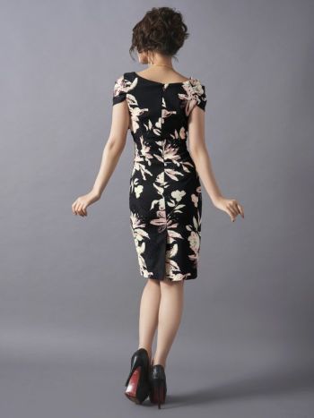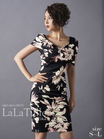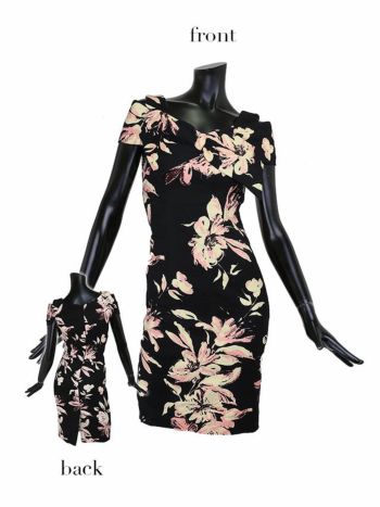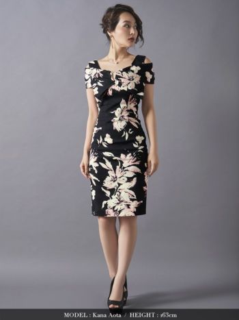 高品質な大人綺麗なキャバドレス♪ フラワープリント オフショルダー タイトミニドレス[ブラック/ベージュ][青田夏奈/キャバドレス着用]
