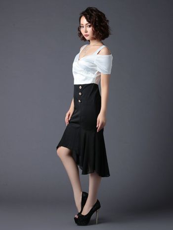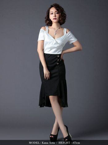 高品質でロープライスなオリジナルキャバドレス♪ ×マーメイドライン バイカラー オフショルダー タイトひざ丈ドレス[ホワイト×ブラック][S/M/L/XL]