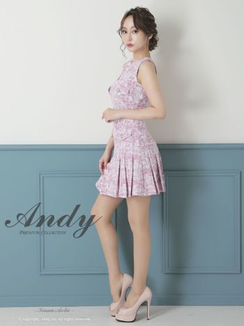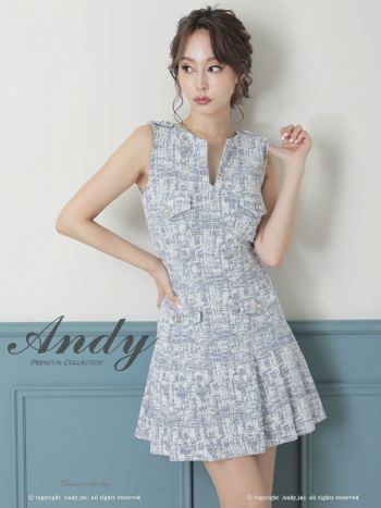 キャバドレス ミニドレス Andy アンディ プリーツ ツイード ストレッチ Aライン パールボタン ミックス柄 スリットネック ノースリーブ フレアミニドレス