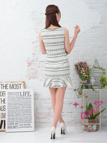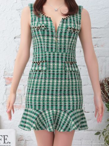 ツイード×フリルがcute♡ 【an/アン】ノースリーブ ツイード チェーン ジップデザイン チェック柄 飾りポケット フレアミニドレス(aoc3510)