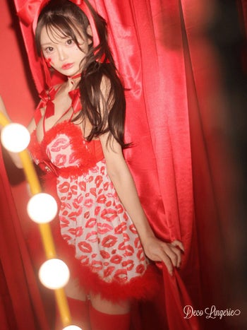 3. 【勝負下着】【Deco Lingerie/デコランジェリー】Kiss柄 ベビードール リボン ガラスビジュー セクシー ランジェリー 4点セット[ブラジャー/Tバックショーツ/チョーカー/ウエストフリル](レッド)(DL30RD)