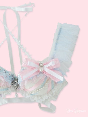 ふわふわパステルランジェリー♡ 【勝負下着】【Deco Lingerie/デコランジェリー】ランジェリー リボン フリル クロスデザイン パール ラブリー 3点セット[ブラジャー/Tバックショーツ/ウエストフリル](ホワイト×ブルー)(DL46WHBL)