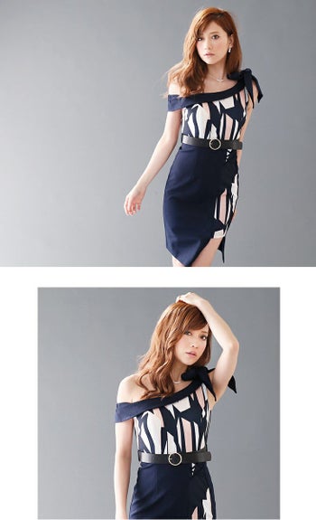 3. 【DEA.by ROBE de FLEURS/ディア】幾何学プリント×リボン オフショルダー タイトミニドレス[ネイビー][Lあり][1441]