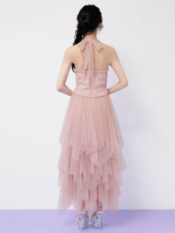 4. 予約商品【1月下旬入荷予定】【Angel R/エンジェルアール】ホルターネック フロントビジュー ウエストカット フリル メッシュ ヘムライン ネックリボン Aラインロングドレス (AR26808)