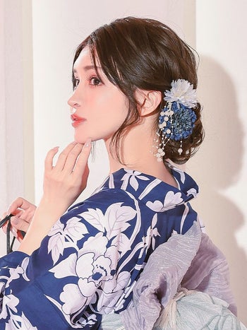 華やかな印象にメイク♡ 【浴衣】髪飾り フラワー コサージュ 垂れ飾り パール ヘアアクセサリー 6点セットSET(グレー/パープル/ブルー)
