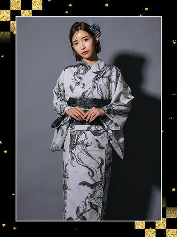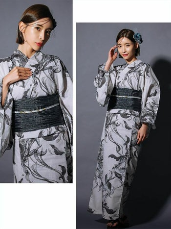 全身に流れるような黒のリーフシルエットが印象的な大人浴衣♪